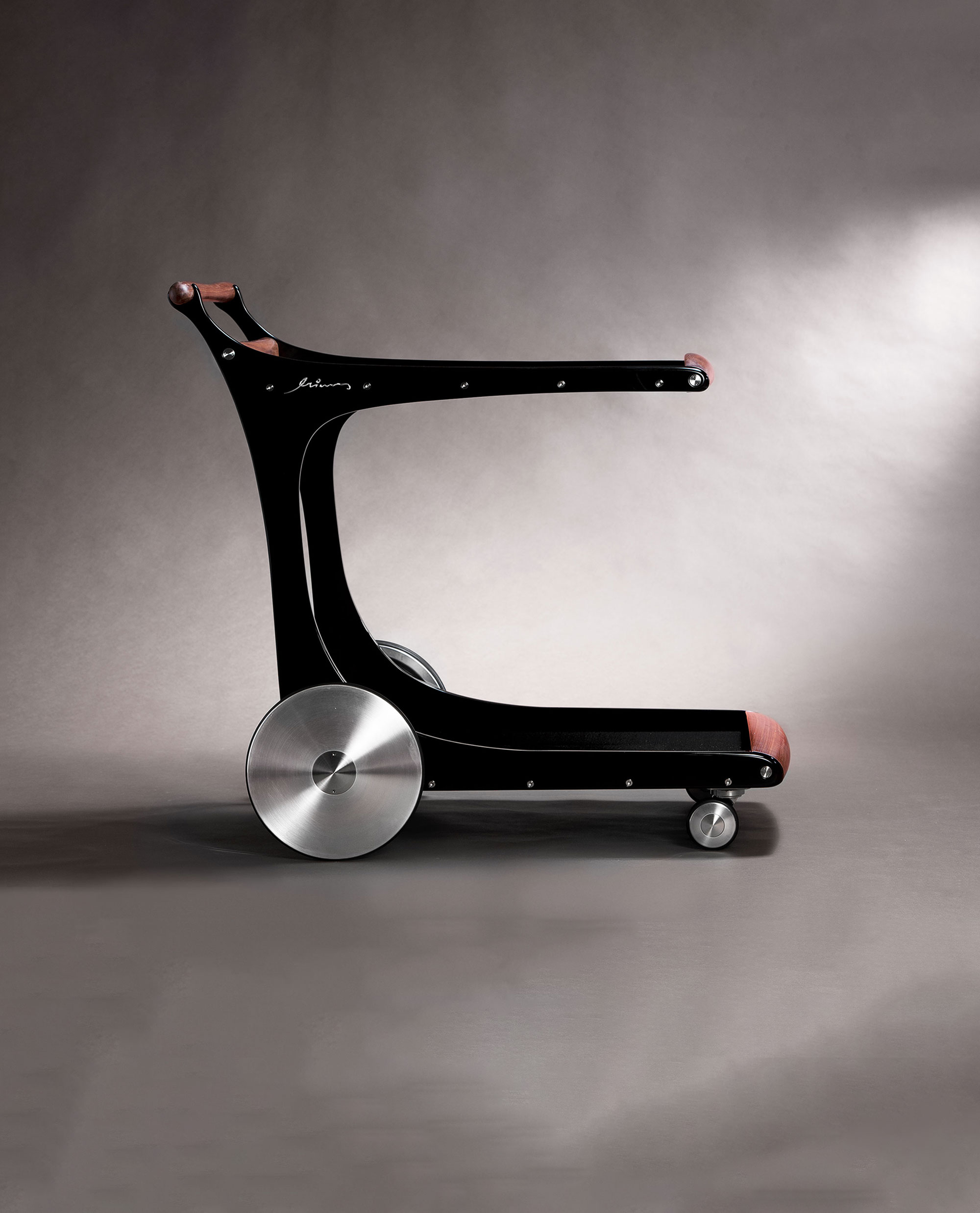 Handmade with powder-coated aircraft-grade aluminum, stainless steel, American walnut, and carbon fiber surfaces, this sleek, aerodynamic trolley ensures effortless mobility and modern elegance. Designed with precision and sophistication, it delivers a refined serving experience for those who appreciate timeless design.